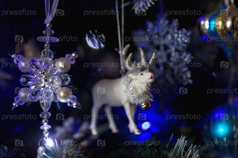 Мягкий фокус. Украшенная елка в бело-голубых тонах. Красивые елочные игрушки на ветках елки. Праздничный фон