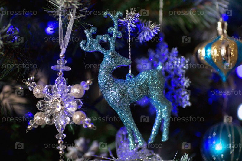 Мягкий фокус. Украшенная елка в бело-голубых тонах. Красивые елочные игрушки на ветках елки. Праздничный фон