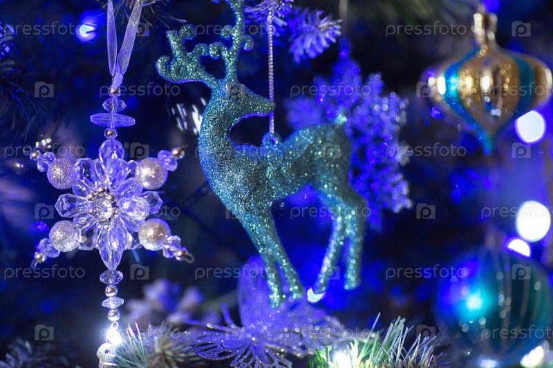 Мягкий фокус. Украшенная елка в бело-голубых тонах. Красивые елочные игрушки на ветках елки. Праздничный фон