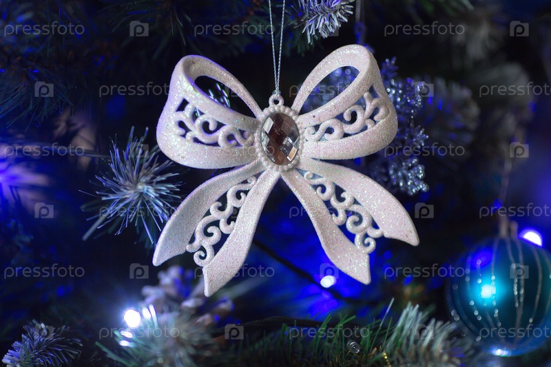 Мягкий фокус. Украшенная елка в бело-голубых тонах. Красивые елочные игрушки на ветках елки. Праздничный фон