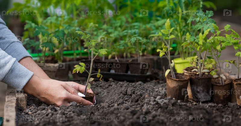 Почва с молодым растением. Посадка рассады в грунт. Рядом лежит шпатель. Концепция сельского хозяйства и урожая. Крупный план