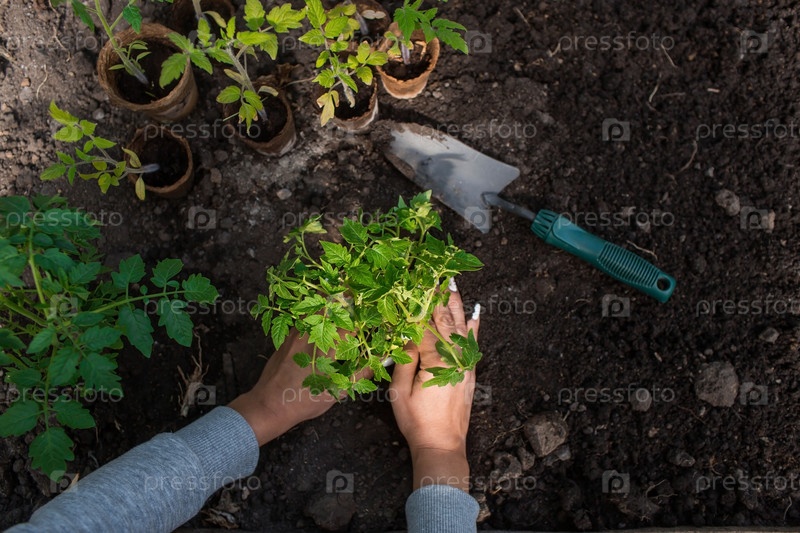 Почва с молодым растением. Посадка рассады в грунт. Рядом лежит шпатель. Концепция сельского хозяйства и урожая. Крупный план