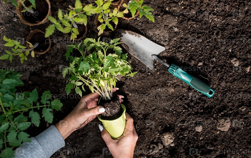 Почва с молодым растением. Посадка рассады в грунт. Рядом лежит шпатель. Концепция сельского хозяйства и урожая. Крупный план