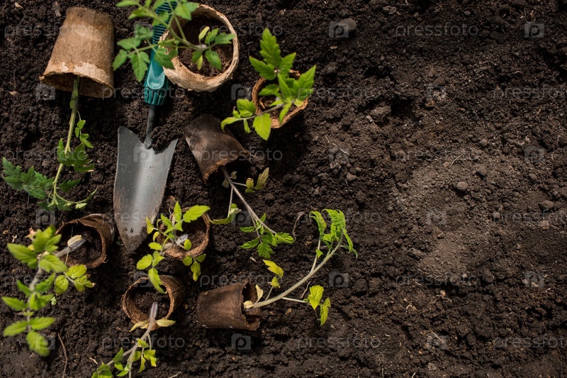 Почва с молодым растением. Посадка рассады в грунт. Рядом лежит шпатель. Концепция сельского хозяйства и урожая. Крупный план