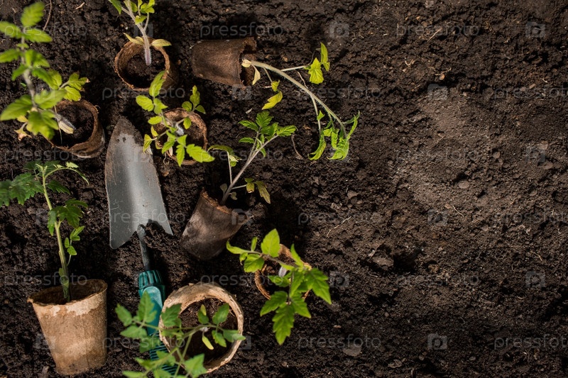 Почва с молодым растением. Посадка рассады в грунт. Рядом лежит шпатель. Концепция сельского хозяйства и урожая. Крупный план