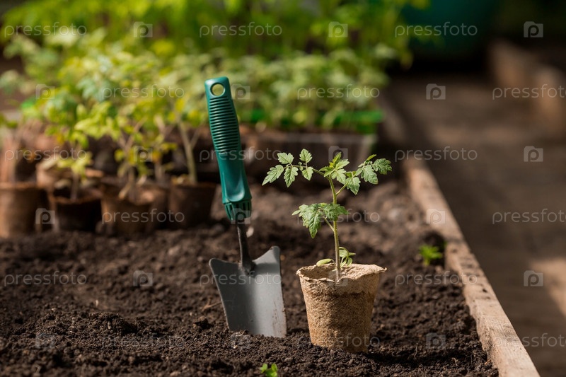 Почва с молодым растением. Посадка рассады в грунт. Рядом лежит шпатель. Концепция сельского хозяйства и урожая. Крупный план