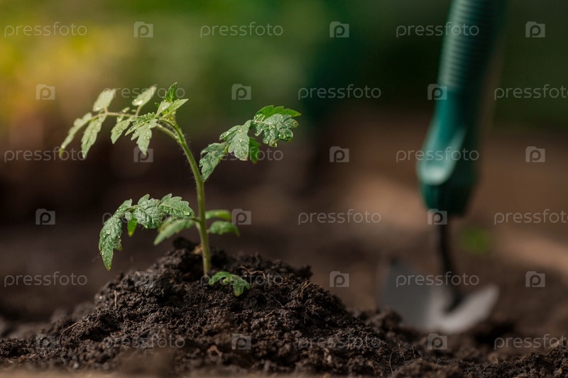 Почва с молодым растением. Посадка рассады в грунт. Рядом лежит шпатель. Концепция сельского хозяйства и урожая. Крупный план