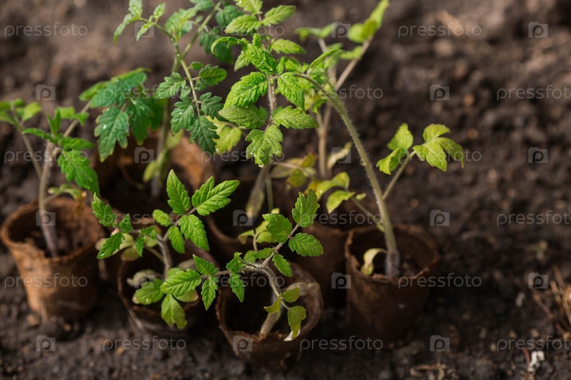 Почва с молодым растением. Посадка рассады в грунт. Рядом лежит шпатель. Концепция сельского хозяйства и урожая. Крупный план