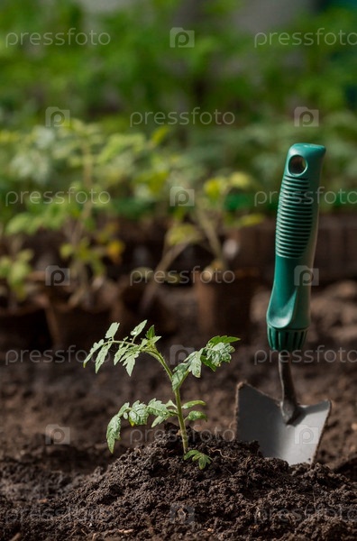 Почва с молодым растением. Посадка рассады в грунт. Рядом лежит шпатель. Концепция сельского хозяйства и урожая. Крупный план