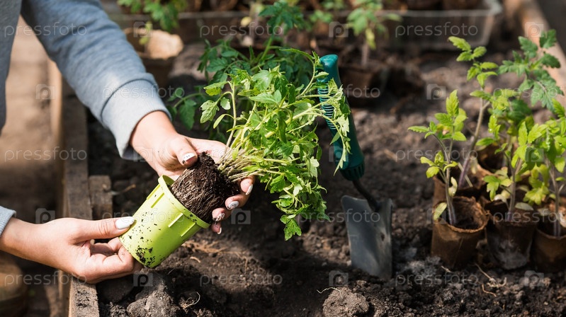 Почва с молодым растением. Посадка рассады в грунт. Рядом лежит шпатель. Концепция сельского хозяйства и урожая. Крупный план