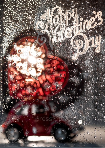 Красная ретро машинка с сердцем на крыше за дождливым окном. Доставка еды из кафе и ресторанов в День святого Валентина. Блокировка, ограничения и грусть в городе из-за коронавируса