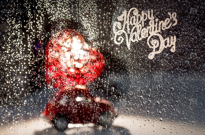 Красная ретро машинка с сердцем на крыше за дождливым окном. Доставка еды из кафе и ресторанов в День святого Валентина. Блокировка, ограничения и грусть в городе из-за коронавируса