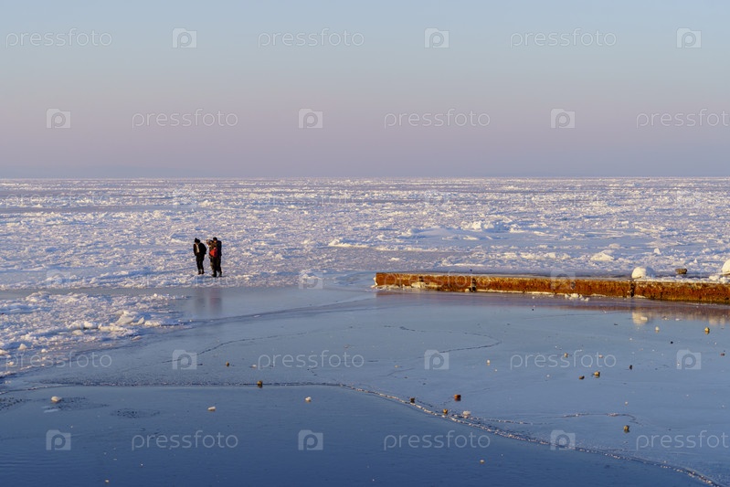 Владивосток, Россия - 7 января 2022 года: Зимний пейзаж с видом на людей на ледяной поверхности моря
