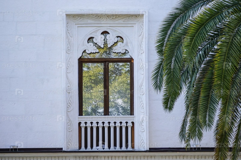 Пальмовые листья на фоне белых стен дома