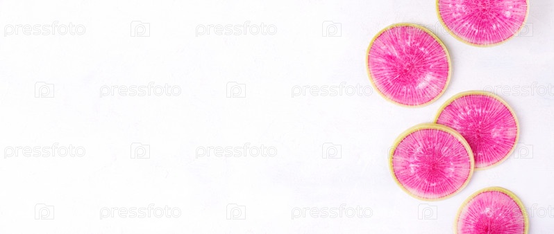 Веб-баннер с ломтиками арбузной редьки на белом с копировальным пространством. Красочный овощ. Вид сверху