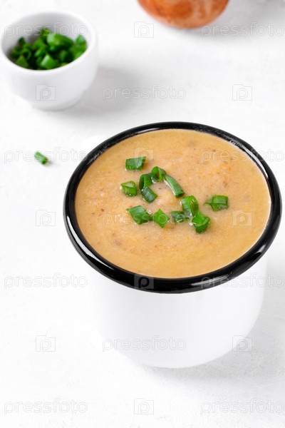 Крем-суп с грибами и сыром с зеленым луком подается в металлической кружке на белом столе. Горячая еда