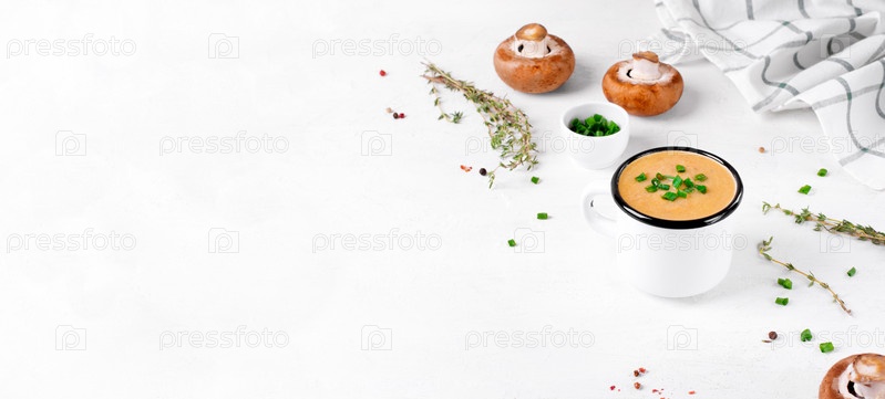 Веб-баннер со сливочным супом с грибами и сыром подается в металлической кружке на белом столе. Горячая еда. Копировать пространство