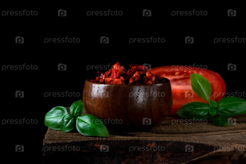Нарезанные кубиками сушеные помидоры в деревянной миске, листья базилика и помидоры сливы наполовину на деревянной доске на черном фоне. Натуральный ингредиент