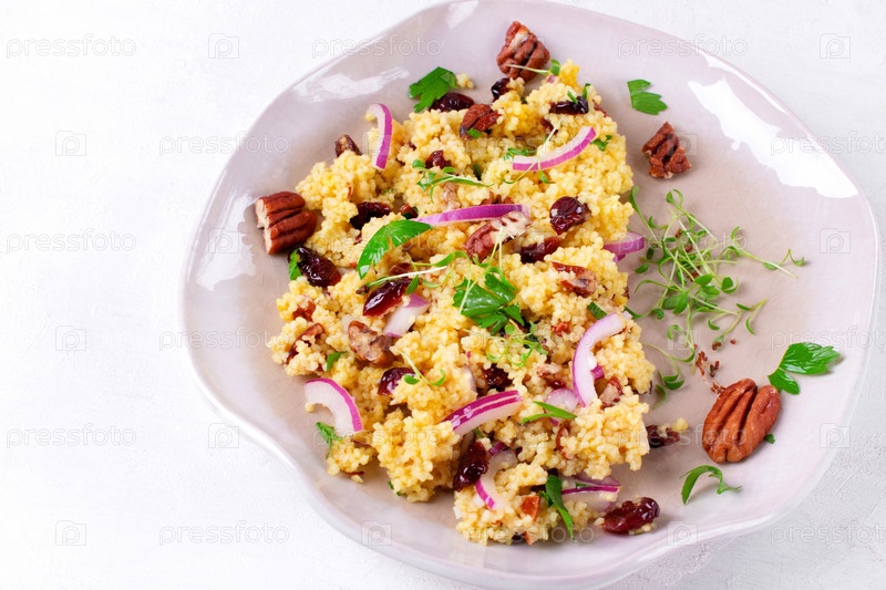 Салат с кускусом, сушеной клюквой, орехами пекан, красным луком, микрозеленью и апельсиновой заправкой на керамической тарелке. Здоровая веганская еда