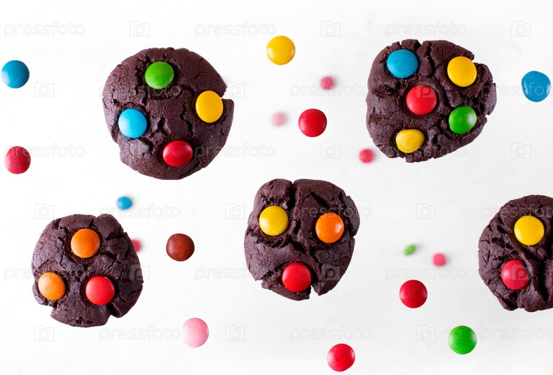 Летающие шоколадные печенья с разноцветными конфетами на белом фоне. Парящий десерт