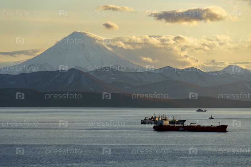 Морской пейзаж с видом на Авачинскую бухту. вулкан и корабли. Камчатка