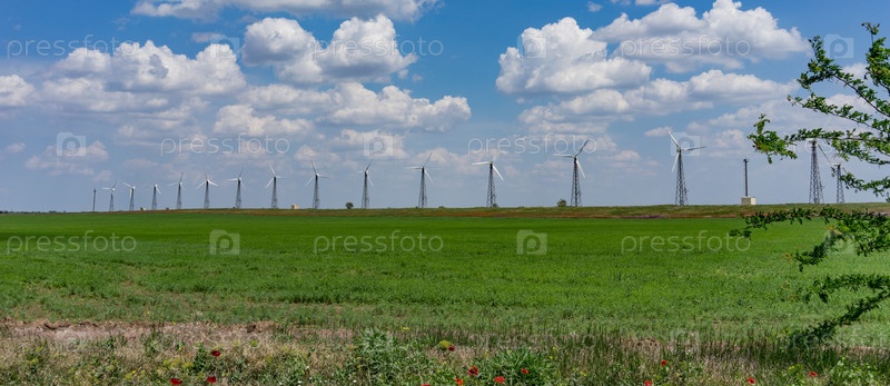 Панорама ветряных электростанций на фоне голубого неба с облаками