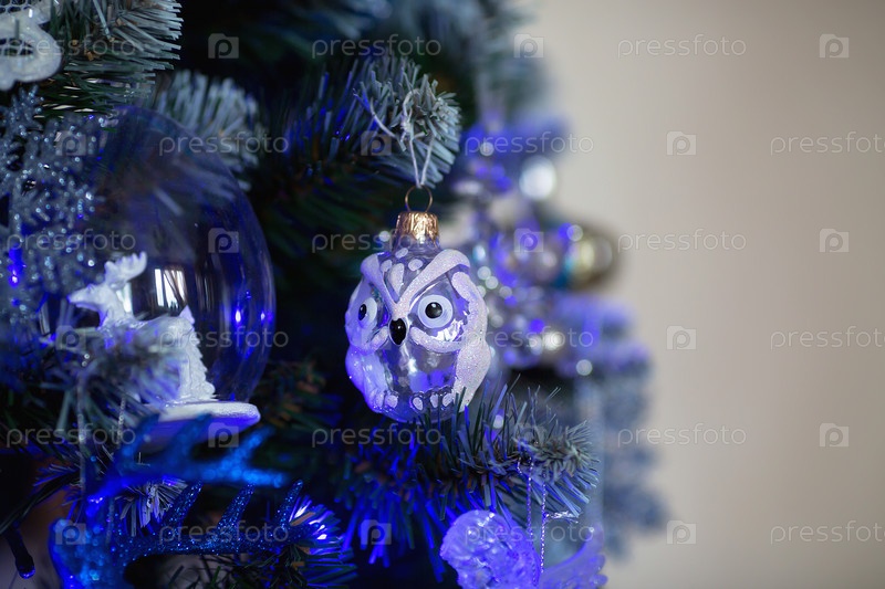 Мягкий фокус. Украшенная елка в бело-голубых тонах. Красивые елочные игрушки на ветках елки. Праздничный фон