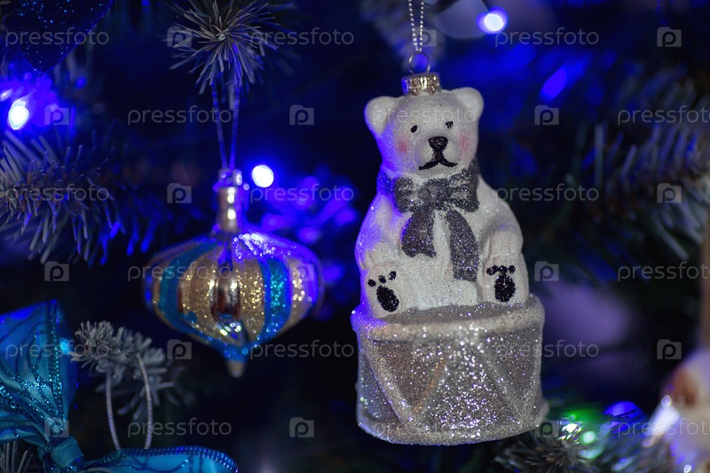 Мягкий фокус. Украшенная елка в бело-голубых тонах. Красивые елочные игрушки на ветках елки. Праздничный фон