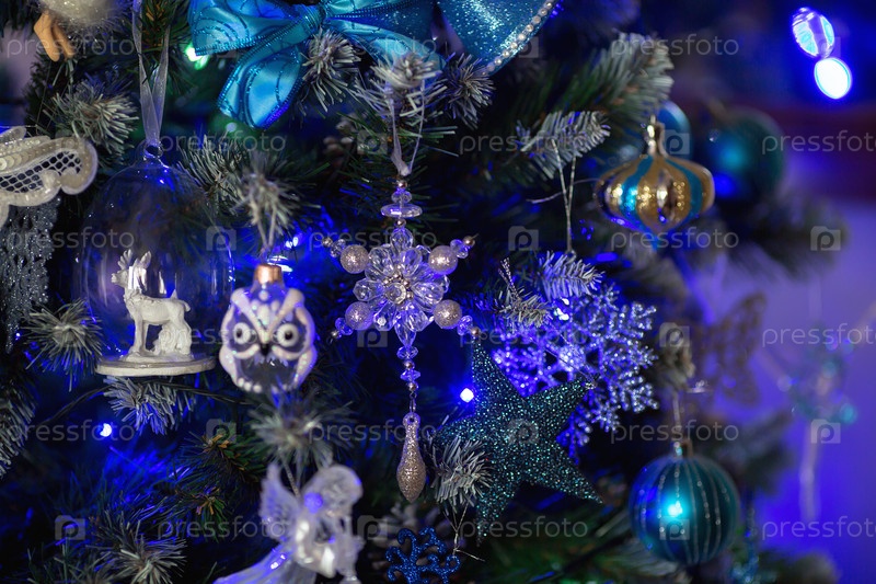 Мягкий фокус. Украшенная елка в бело-голубых тонах. Красивые елочные игрушки на ветках елки. Праздничный фон