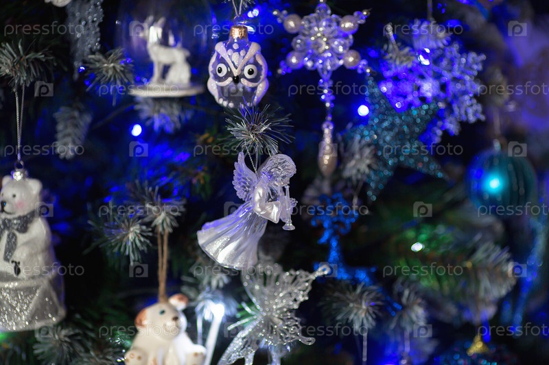 Мягкий фокус. Украшенная елка в бело-голубых тонах. Красивые елочные игрушки на ветках елки. Праздничный фон