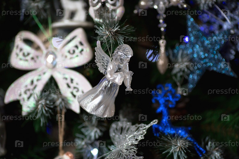 Мягкий фокус. Украшенная елка в бело-голубых тонах. Красивые елочные игрушки на ветках елки. Праздничный фон