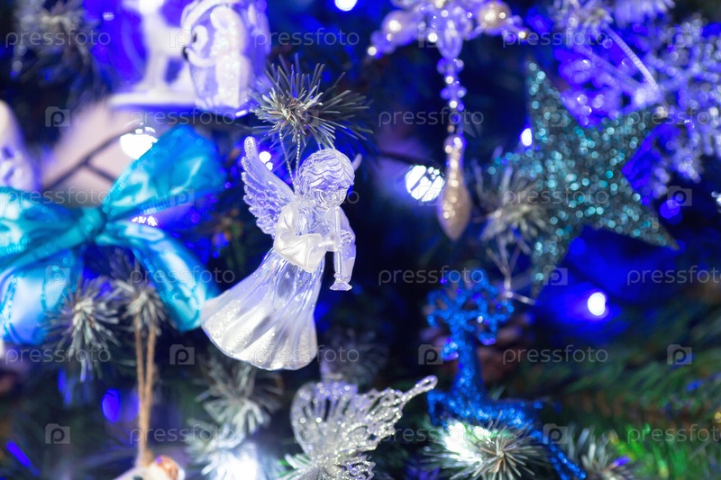 Мягкий фокус. Украшенная елка в бело-голубых тонах. Красивые елочные игрушки на ветках елки. Праздничный фон
