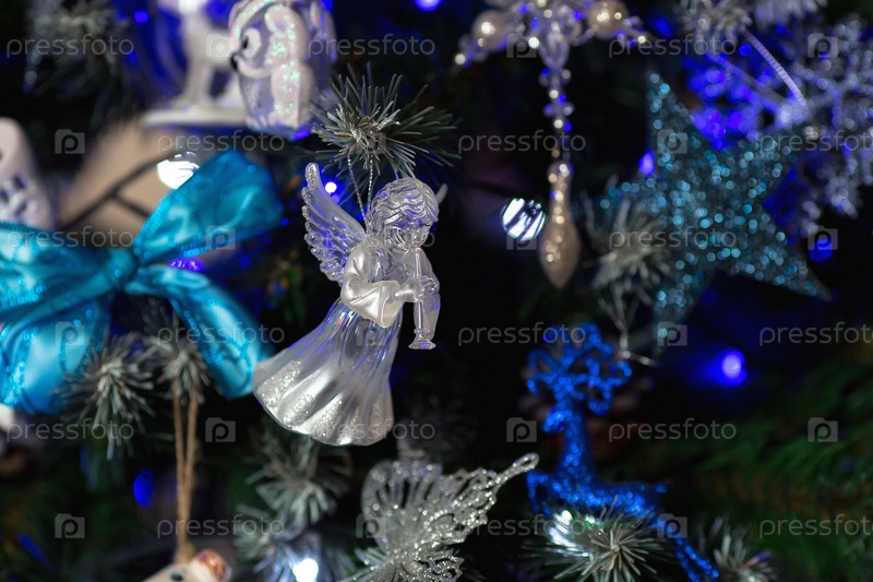 Мягкий фокус. Украшенная елка в бело-голубых тонах. Красивые елочные игрушки на ветках елки. Праздничный фон