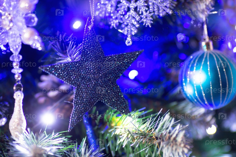 Мягкий фокус. Украшенная елка в бело-голубых тонах. Красивые елочные игрушки на ветках елки. Праздничный фон