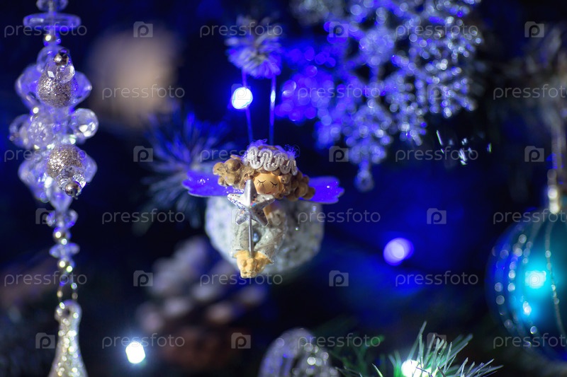 Мягкий фокус. Украшенная елка в бело-голубых тонах. Красивые елочные игрушки на ветках елки. Праздничный фон