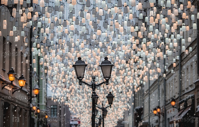 Рождественские украшения. Красивые праздничные пейзажи Москвы. Столешников переулок украшен красивыми фонарями. Россия