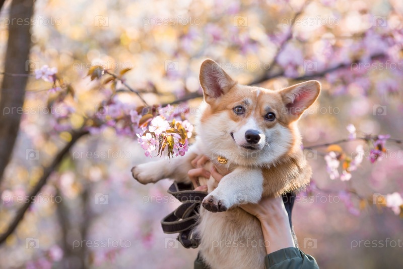 Цветение вишни. Весна, природа фотообои. Вишневый цвет в саду и маленькая собака корги крупным планом. Цветущие бутоны роз на ветвях дерева