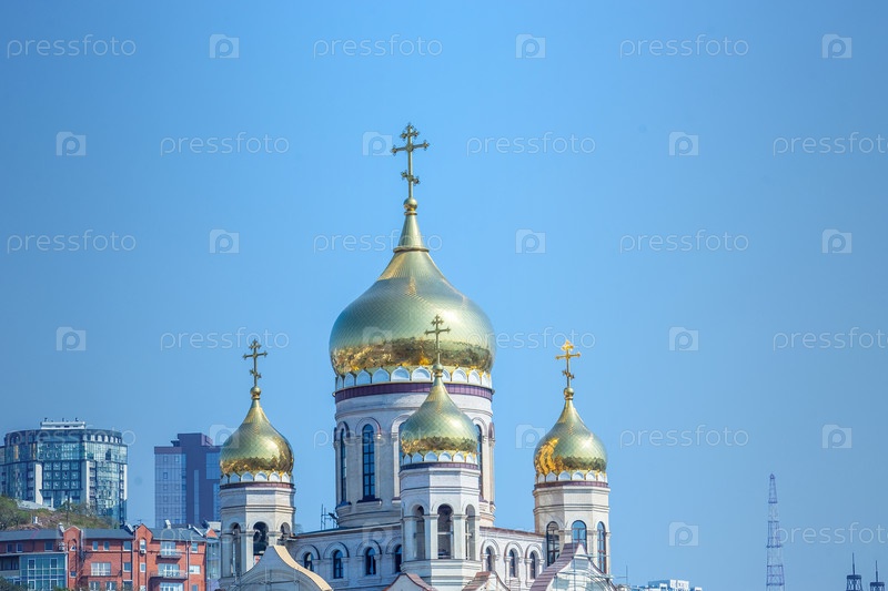 Городской пейзаж с видом на золотые купола храма