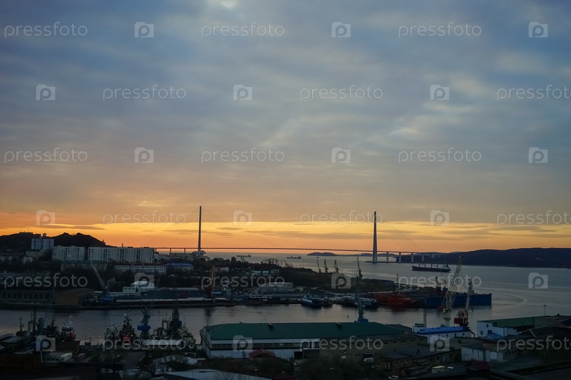 Городской пейзаж с видом на восход солнца. Владивосток