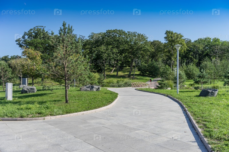 Путь в современном ухоженном парке с зелеными деревьями и деревянным мостом