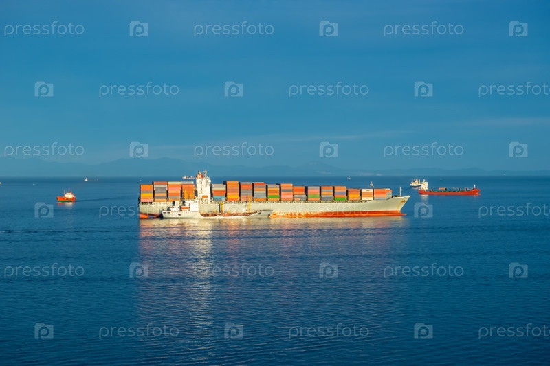 Морской пейзаж с большим контейнеровозом на фоне моря