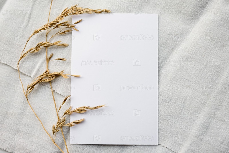Сцена макета канцелярских товаров в светлом ключе. Пустая вертикальная поздравительная открытка и сушеные зерна на белом льняном фоне
