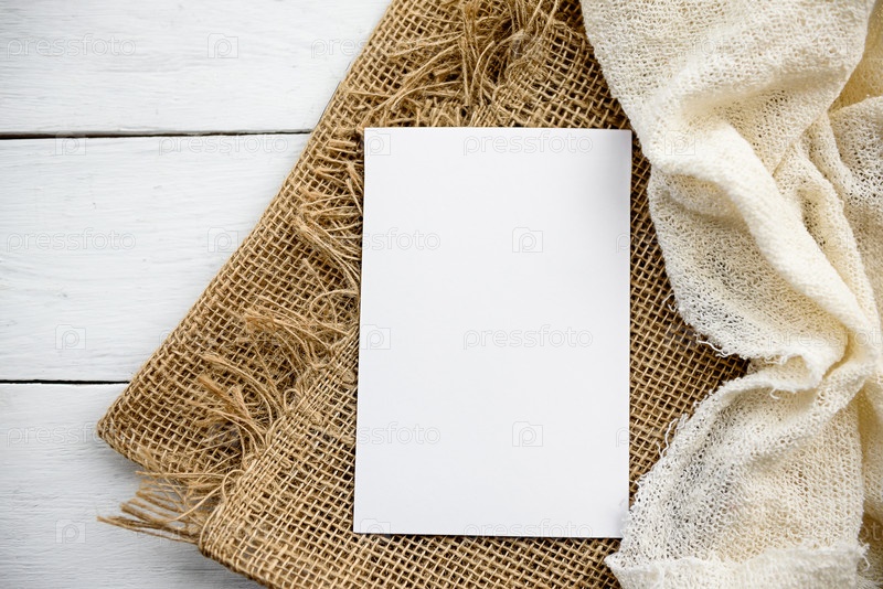 Сцена макета канцелярских товаров в светлом ключе. Пустая вертикальная поздравительная открытка и сушеные зерна на белом льняном фоне