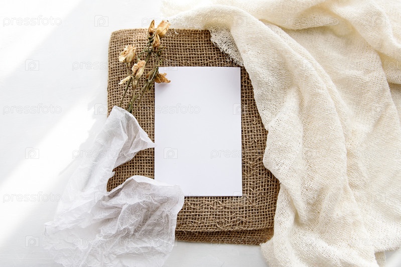 Модный канцелярский фон - белая карточка для надписей и сухих растений и цветов на белом столе