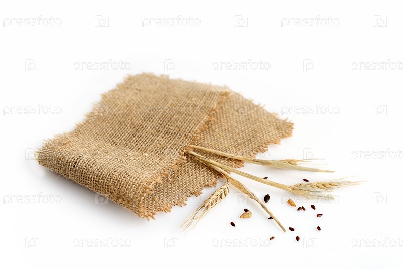 Колосья пшеницы в мешковине на белом