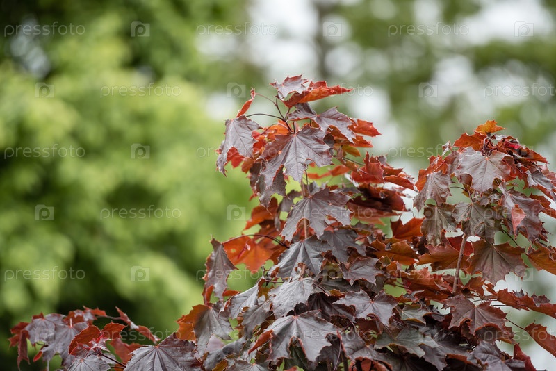 Ветка красных кленовых листьев на естественном зеленом фоне