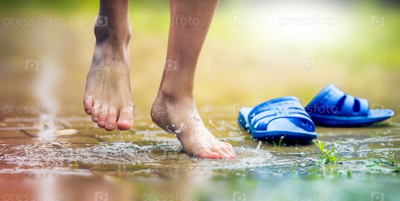 Ноги мальчика, прыгающего в лужу дождя без обуви