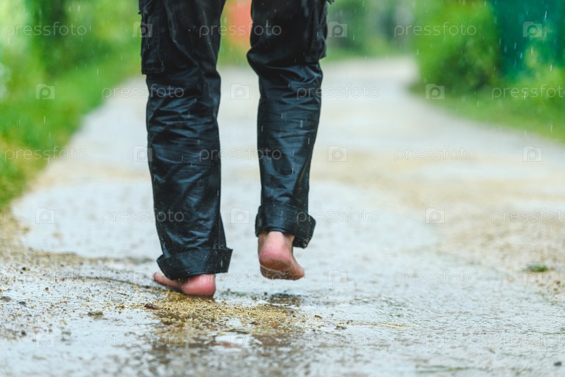 Человек под дождем босиком по лужам