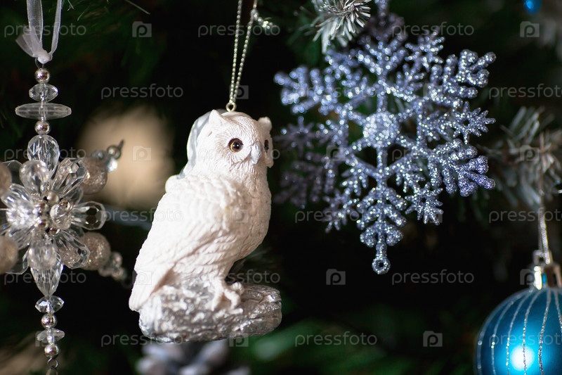 Мягкий фокус. Украшенная елка в бело-голубых тонах. Красивые елочные игрушки на ветках елки. Праздничный фон