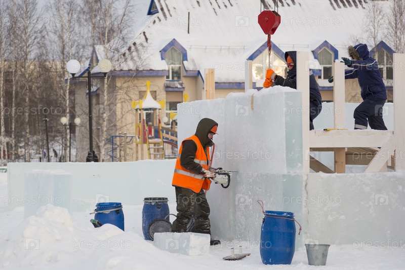 Монтажники на строительстве ледового городка